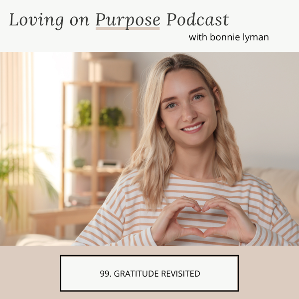 Episode 99: Gratitude Revisited This is Bonnie Lyman, and you're listening to the podcast, Loving on Purpose, episode 99, Gratitude Revisited. Welcome to the podcast, Loving on Purpose. I'm your host, Bonnie Lyman. If you're having trouble navigating through your relationships with your adult children, if you are struggling to connect with them or having specific challenges, You're in the right place. Welcome back to my podcast, Loving on Purpose. Welcome to anyone new listening for the first time. Thank you for those that have shared it with people you feel would benefit from it. I do appreciate you listening and sharing it and helping those be able to get along. And having more loving and harmonious relationship with their adult children. This week is Thanksgiving and in the throes of things, I was trying to come up, of course, with a topic on gratitude. And I decided that it's been over a year since I did a podcast on gratitude. So I decided that it was worth Publishing, rebroadcasting, again. So, if you've heard it, my apologies. I think it's worth listening to again. And if you're a new follower, I hope that you enjoy it. And I wish all of you the best of holidays. Know going into it, that focus on what is going right. With everyone and not what you're displeased with. And I just want to say, I just wish the very best for you and your family tomorrow. Your friends, my heart goes out to those of you that. Are feeling maybe neglected by your adult children and are having it alone. If you're doing that, see if you can find somebody to hook up with or someone to invite over. Or, it doesn't even have to be a turkey dinner. But just get together and play cards, do a puzzle, have some sort of a meal. It's, it's a time of year to be thankful and grateful, and I would also say appreciative of yourself. So, like the title of my podcast said, when we have gratitude, when we are grateful, it actually is a gift we give to ourselves, because, There is nothing that can make us happier than that feeling of gratitude. I can remember when I was going through a very difficult situation with one of my adult children, and it was actually causing me some fear of the outcome, and I really wanted a miracle to happen. And so I ran across a book that was called How to Pray for a Miracle. And what they said in this book was to have all your prayers just be prayers of gratitude. And I thought that was interesting. Because a miracle does happen when we are grateful for what we already have. And I know for a lot of people, That's hard to do, and I'm not, I'm not saying to force yourself into feeling that way or pretending you're grateful, but even finding the smallest thing. So one of the things I wanted to start talking about was appreciation. And appreciation, I feel, is a little different than gratitude. I think of gratitude. As a feeling and I think of appreciation is something that we have to do. We have to take action and then we eventually will feel also appreciation. But it's kind of noticing things. And I guess I'm thinking particularly in being appreciative of yourself. So it's, it's maybe not so much an action, like I said, but appreciation is a thought that causes us to have the feeling of gratitude. But I had an email a couple of weeks back where I talked about, I think it was titled, Gratitude is a Verb. And so what do we do when we're feeling grateful? And that is where the reward comes back to us. Now I'm not saying we do good things just to get a reward, but I do know It's things that make us feel good. We tend to repeat. And so having gratitude, if that will cause us to do something good, we're going to feel good. But first of all, let's go back to this, um, concept of appreciation. So it's, it's number one, appreciating who you are. And, and that you were even born. And then it's appreciating what your body can do. I just think it's incredible. I don't have to do anything to tell my heart to pump blood through my body, or my lungs to breathe, or for my... spleen or my kidneys to do what they're supposed to do to help my body function and, and keep it healthy. And I do have some influence on that, on how I treat my body when I put into it, but it kind of does a lot of things automatically. And so I think it's good. To remind ourselves how amazing our body is. And I think it's even better to get up every morning and look yourself in the eye in the mirror and tell yourself, Thank you, body. Thank you, self. Thank you, Bonnie, for having this amazing body and being so amazing. I don't think that's being, um, prideful. I think it's just being appreciative. And it'll come back to you. So when we're appreciative of ourselves, we recognize our desires, and that may go into defining who you are, or what you want to do in this life. And the being... I'm appreciative that the capacity or the potential to do that is already inside of you. We can do anything we want if we just don't let our brains get in the way of causing doubt and overwhelm. But I'm appreciative. of my body and this brain that just has my heart on automatic pilot. And so, because we have this great and wonderful body and this brain, and if we have the desire to serve others, it's going to make us feel good. But, you know, there have been times in my life Because of health and physical and emotional, I'm in 24 7 pain right now and I just refuse for that to hold me back from Living the way I want to live my life right now. But there's other times that I was really suffering from depression and anxiety. And if I was asked to do too much, it, it was overwhelming to me. So, I would first have the thought, how disappointing I'm feeling. That I can't do what I used to be able to do. And then I couldn't serve others. I couldn't serve God like I used to be able to do. But then I had the thought, but God knows my heart. Because if I wasn't depressed, or if I wasn't in pain all the time, I would serve more if I could. So I used to say to myself, I 