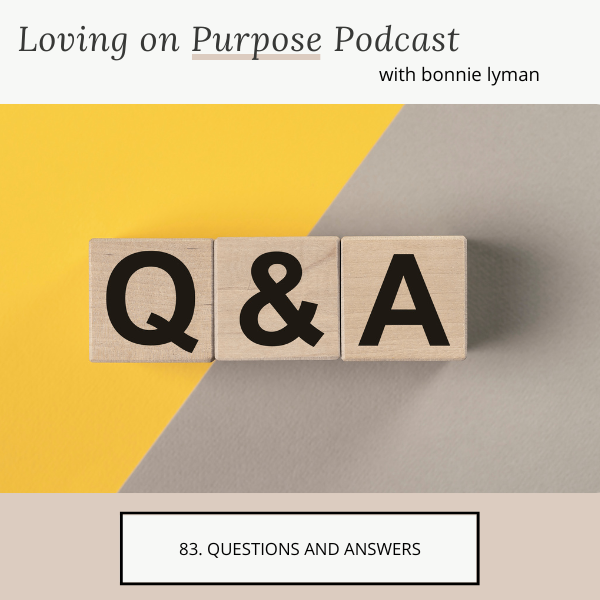 Episode 83 Questions and Answers I am Bonnie Lyman and you are listening to the podcast, loving On Purpose, episode 83. Questions and answers. Hello everyone. I. I'm hunkered down in what we call at our house away, far down basement. It's 90 something today, which isn't too hot, but we live in a 70 year old home, which I love and is very comfortable and functions very well except the air conditioning. If you go to the way far down level, I almost need to put a little sweater on. But it's cool down here, up in my bedroom, it's about 85 degrees and it's very warm, so I'm here. Joyfully talking to you. I hope you're having a good summer. I love connecting with you in this way, and I wanna thank everybody that submitted questions to be answered that were on your mind. So we're gonna talk about some general things because I believe the answer to solving any problem is really. Pretty much the same, even though we can use the same tools to solve any problem besides diseases and those kind of things. It still takes some work. It takes desire and it's not always easy to do, so I. One of the things that we neglect doing is allowing ourself to feel the negative feeling of whatever that problem is creating, because anytime we resist anything, we intensify it so, You could almost say that when you resist reality, and I am thinking in the cases which I think are. Really sad situations when children tell their parents that they no longer want any contact with them and they cannot have any contact with their children, the, the parents. The grandparents aren't allowed to see their grandchildren. That's painful. That hurts. But if we resist it and we never come to accept that this is the reality. Of what's gonna be happening for, we don't know how long. Hopefully not forever, but maybe. We only make ourself more miserable and prolong moving forward in finding satisfaction in our life in other ways. I know a lot of us, especially those that belong to my church, there's a lot of emphasis that there is nothing more important than families and I. I believe that, and I believe that the connection between families, it never dies. It may change, but it never dies. But the type of context. Contact that families have differ greatly between families to family. It has a lot to do with the personalities of people, different circumstances, different experiences of how the parents were raised and what they bring to the table in raising their children. D n A has a, a factor, and I've done a lot of study on this and I, I haven't come up with an answer that satisfies me as to why children. Are doing this. I had a difficult relationship with my parents as an adult and I, I can't say that I ever really longed. To see them or be with them because of how they reacted to me. But I would never think of cutting off all contact and especially cutting off contact between them and seeing their grandchildren. My children, which my mother at least had a very good relationship with. So, One of the basics in solving any problem is, like I mentioned, is, is you first have to feel that negative emotion and then we have to learn to accept reality. That things maybe didn't turn out the way we thought they were going to turn out, and so we don't wanna judge ourself for. You know, having bad feelings. And the other thing is we don't wanna be in a hurry to get out of feeling these negative problems because it doesn't solve the problem any faster. In fact, if we judge ourself that we shouldn't be feeling this way or blaming ourself for what's happening, we just keep adding on layers and layers of additional negativity and realities. Is that it's part of being human, that we come across hard things in our life, things that we thought weren't gonna happen, things that we don't want to happen, but we have to remember that even the tools that we do have to feel. A little better about what's going on to feel compassion, to feel hope, or to always love our children regardless of their action. We're, we're not gonna feel that way all the time. There's, there's no such thing as being positive all the time. That's like this Pollyanna world, and it's just not realistic. We know that there's opposition. In all things, and the sooner we accept that and embrace that and be willing to feel some discomfort for a while, the better. We're going to figure out how to either see things from a different perspective or have different thoughts that will help us move forward. So just some other general thoughts I had about the questions that were asked was, we can always be ourselves. There was some things that came up that all talk about later in some of the questions that came up and answer, but, We can always show up just as we want to show up. We can ask any question. We can make any request of anybody, but especially our adult children if we do it in, in a atmosphere of love and kindness. I. Not judgment. Nobody likes to be judged. And any time we accuse somebody or even trying to defend our side is, is often a way of saying, I'm right and you're wrong. We judge people. We judge them by insinuating. You don't understand my side and. Every, everybody wants to be in a place where they have their own autonomy, where they govern themselves and exercise their agency the way they want to. Everybody is entitled to their own opinion and we cannot take that away from somebody else. And when. Another person's senses that that is being threatened. Then we have more contention in the relationship. We need to be honest. A lot of times we'll say, oh, it's fine, and it's not fine. You at least need to be honest with yourself that I don't like what's going on, and then just sit with the discomfort for a while. We all look at things differently. We have different thoughts that cause us to have different feelings because we all have our own brain, and so we have to recognize that there nobody has to see things in the same way that I do. Or that we do, that we have the right to vi