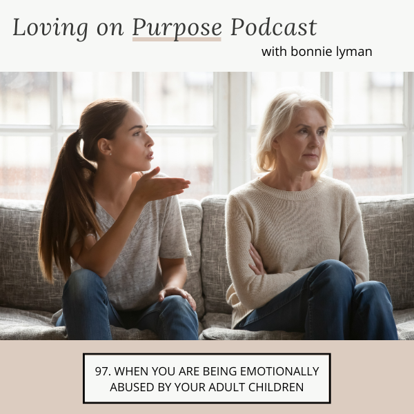 Episode 97: When You are Being Emotionally Abused by Your Adult Children . I'm Bonnie Lyman, and you're listening to the podcast, Loving on Purpose, episode number 97, when You are being emotionally abused by your adult children. Welcome to the podcast, Loving on Purpose. I'm your host, Bonnie Lyman. If you're having trouble navigating through your relationships with your adult children, if you are struggling to connect with them, or having specific challenges, you're in the right place. Hello, my friends. I hope you're having a good week. I had an interesting day today. It wasn't my favorite. I think I mentioned we got a little puppy, a little Cavapoo, which we call Miley. And I love this puppy. In fact, I just had to spend 500 replacing some carpet that this puppy, uh, broke a pen and got ink all over part of it. Luckily, it was at the top of the stairs in a little, I don't know, eight feet by eight feet area, so I didn't have to re carpet the whole house. But, you know what? I just love that dog still. There's no thought of getting rid of the dog. It's, there's a lot of thought of, Be more careful with your pens. And, anyway, I love this dog. This dog sleeps on my bed at night, and I quite, I quite like that. Having had five kids, having a lot of energy in the house, a lot of that energy is gone. Even though many of them live nearby and I have grandkids, They are busy in their lives, and would I like them to come over more? You bet. But even just being a half hour away takes away from their schedule and what they prefer to do than to just come and make Mimi happy. And so we got a dog. And it fills a gap, and it feels wonderful. But today, my dog had this, well, for the last several weeks, has had a very strange cough, and coughs up a lot of phlegm. And so I took it to the vet today, and he said, I just want to take some x rays, so come back in a couple hours. And all was well. And I was confident and calm until I got a text saying that the doctor wanted Miley to stay for a couple more hours, and I thought I was going to lose it. Of course, my mind went to... The negative. And right then, my back was probably hurting, and it was about three o'clock in the afternoon. She'd been there since nine. I was tired. And so, I, I broke down, and it was hard on me. The thought of something happening to this dear, sweet, little puppy was, Overwhelming to me, but I took some deep breaths and as I talked about last time, I didn't take as much time as I should have just to feel the negative emotion, but I got in the car and drove over to the vet's office because A couple hours had passed and I called for an update and they weren't answering the phone. So I needed some information, so I took some action. If you didn't hear last week's podcast, go back and read it. Sometimes taking some positive action can bring us a lot of peace. But to make a long story short, They still don't know exactly what's wrong, but with some x rays and an ultrasound, they know that nothing major is wrong. And that's what I needed to hear. So that's my life with me and my dog. So I hope you're having a good day. I hope you Are watching your thoughts and seeing which parts of your life that you do want to control, not only control, but what do you want to create in your life? I think of you, especially at this time of year with the holiday. And one of the biggest things we do is we compare and we hang on tight and listen to what other people are doing for the holidays. And oftentimes it seems a lot more ideal. And more of what we were hoping for to be happening in our lives during the holidays. And I'm happy for those people where family want to get together. And I'm sure there's drama in every family. But mostly there is peace and happiness and good times and lots of cousin times together. But that's not who I work with. I work with the women that are hurting. And when I'm coaching, I can't hurt with them. Because if I do, I can't help them. But I, I want those that are listening to know that I do what I do because it hurts me that you are hurting when there could be a way out. There are options out there not to be hurting. But it takes stepping outside of the box and taking some actions that you never thought you ever would be taking. Or to be looking at what's going on from a different perspective and have different thoughts that will cause you to have different feelings. So what I'm going to share with you, I, I hope it's helpful to those of you. That are emotionally abused by your children. And I know that there's a lot of that going on right now. I'll get into it a little bit later, but the thought just came to me that these adult children are often emotionally abusing themselves. And they react in a way where you get the brunt of their frustrated pent up feelings. I talk a lot about when I say love always wins. And I honestly believe that even with abusive children. If we can still love them, but still do some of the things that I'm going to suggest to you that in time their hearts may turn, but your heart will always be in the right place because we, we have been asked by one greater than us. To love everyone, and I think that is for our benefit, that if we aren't loving people that are difficult to love, we will always be in some state of, um, disappointment, revenge. We will not be in a state of peace. But when I say love always wins, and we need to learn how to love everyone, that doesn't mean That you choose to be your child's punching bag. And I'm going to say this three or four times in this episode. You can love your child and yet dislike their behavior. You can love your child and not want to be around them. And sometimes you need... To do that, because we can only be punched so many times. Um, yes, we could do the work. When I say punched, I don't mean physically, but emotionally. Being abused, taking their frustrations out. On you, you, if it was once in a while, you could do the work and be able to remain in